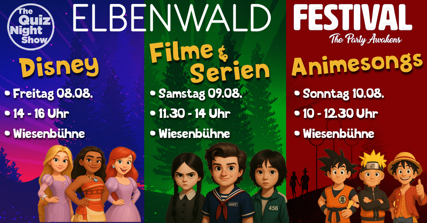 Eine Quiz-Show auf einem Festival - passt das überhaupt zusammen? Klar, warum nicht? Die Quiz Night Show - selbsterklärend eine Mischung aus Pubquiz und Late Night Show - schmeißt bereits seit über 12 Jahren mit lustigen, verrückten, kuriosen und interessanten Fragen nur so um sich. Seit 2018 ist das Quiz außerdem fester Bestandteil des ELBENWALD-Festival und begeistert dort seit jeher mit seiner witzigen Moderation und jeder Menge nerdiger Fragen. Auch 2025 sind wir wieder mit drei ganz besonderen Quizzen für euch auf der Mainstage des Festivalgeländes und haben auch tolle Gäste und Preise dabei!