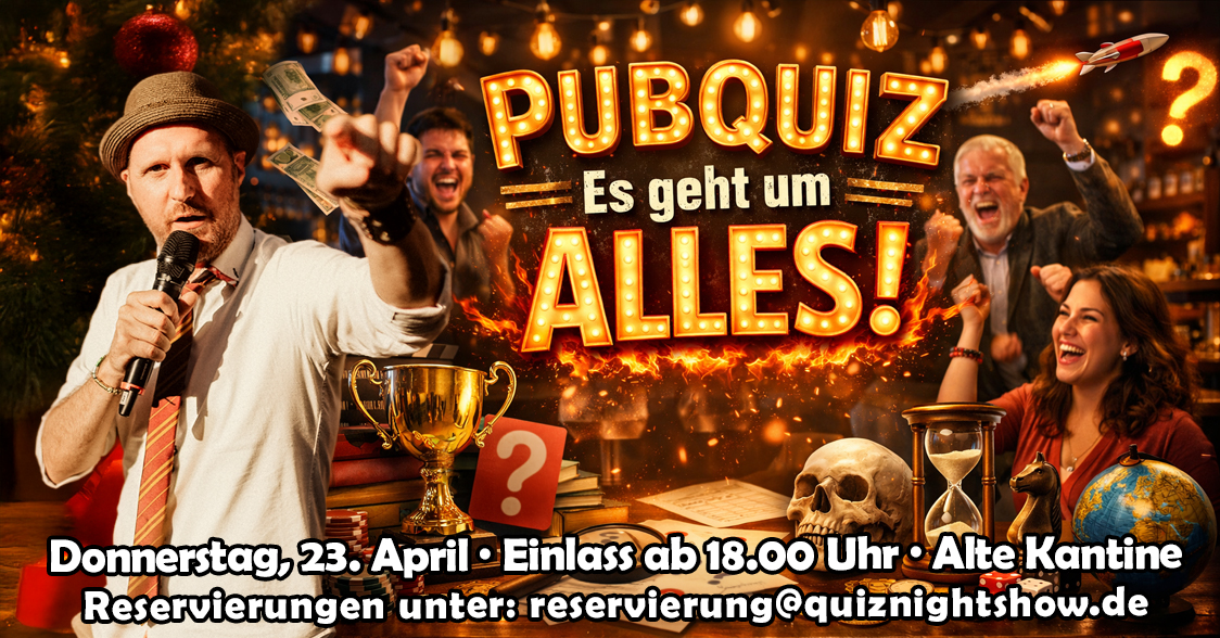 📝 – Eintritt + Tischreservierungen = 10 € pro Person. Anfragen via E-Mail an: reservierung@quiznightshow.de (Teilnehmeranzahl und Datum angeben!)